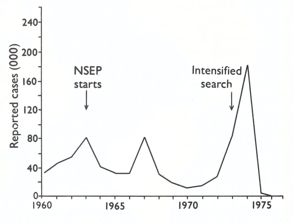 Plate 4.3. Evidence of the underreporting of variola major. Increase in the number of reported cases in India following the introduction of active searches in the highly endemic states in 1973 (see also Chapter 15, Fig. 15.15). NSEP = National Smallpox Eradication Programme of India.