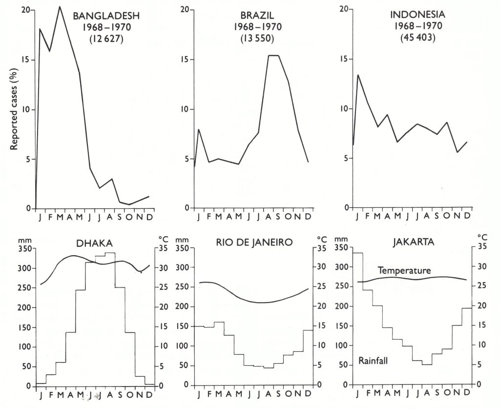 Fig. 4 .6. The monthly incidence of reported cases of smallpox in countries situated in the Northern Hemisphere (Bangladesh), mainly in the Southern Hemisphere (Brazil) and in the tropics (Indonesia), as observed during the Intensified Smallpox Eradication Programme. Figures in brackets indicate numbers of cases. The lower graphs show the average monthly rainfall (mm) and maximum temperatures (°C) for Dhaka (Bangladesh), Rio de Janeiro (Brazil) and Jakarta (Indonesia). There was a pronounced seasonal incidence in countries with well-marked wet and dry seasons, but this feature was not as obvious in localities in tropical countries with sustained high humidities, such as Java (Indonesia), or Madras (India).