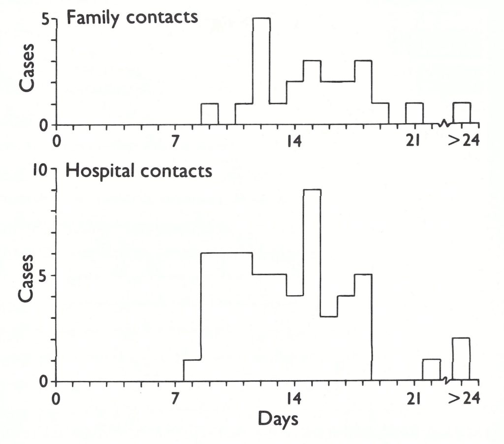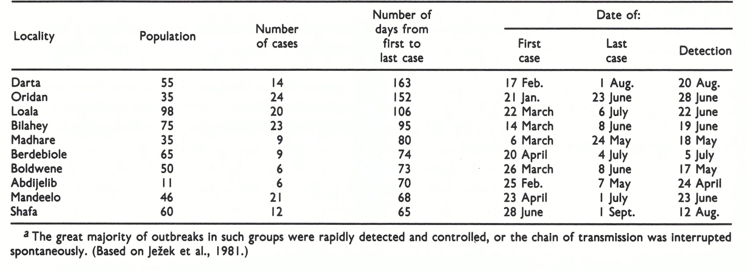 The devastating effects of smallpox in nonimmune populations in the Americas, southern Africa and the islands of the Pacific Ocean (see Chapter 5) gave rise to the view that it was one of the most infectious of all diseases. It is true that very brief exposures of susceptible persons to a case did occasionally lead to infection. For example, one case in the outbreak at Meschede, described above, was a person who had never been in face-to-face contact with a case of smallpox and had been exposed to possible airborne infection for a period of 15 minutes or less. The last person to contract endemic smallpox in the worldthe unvaccinated hospital cook Ali Maow Maalinwas exposed to the disease for a few minutes only, while he directed a vehicle carrying two active cases of smallpox from the hospital in Merca, Somalia, to the home of the local smallpox surveillance team leader (Deria et al.,1980). Sometimes one index case infected a dozen or more people, as in the outbreak in Yugoslavia in 1972 (see Chapter 23). These episodes, however, were exceptional. Epidemiologists engaged in the global smallpox eradication campaign in Africa, South America and Asia agree with Dixon (1962) that smallpox usually spreads rather slowly.