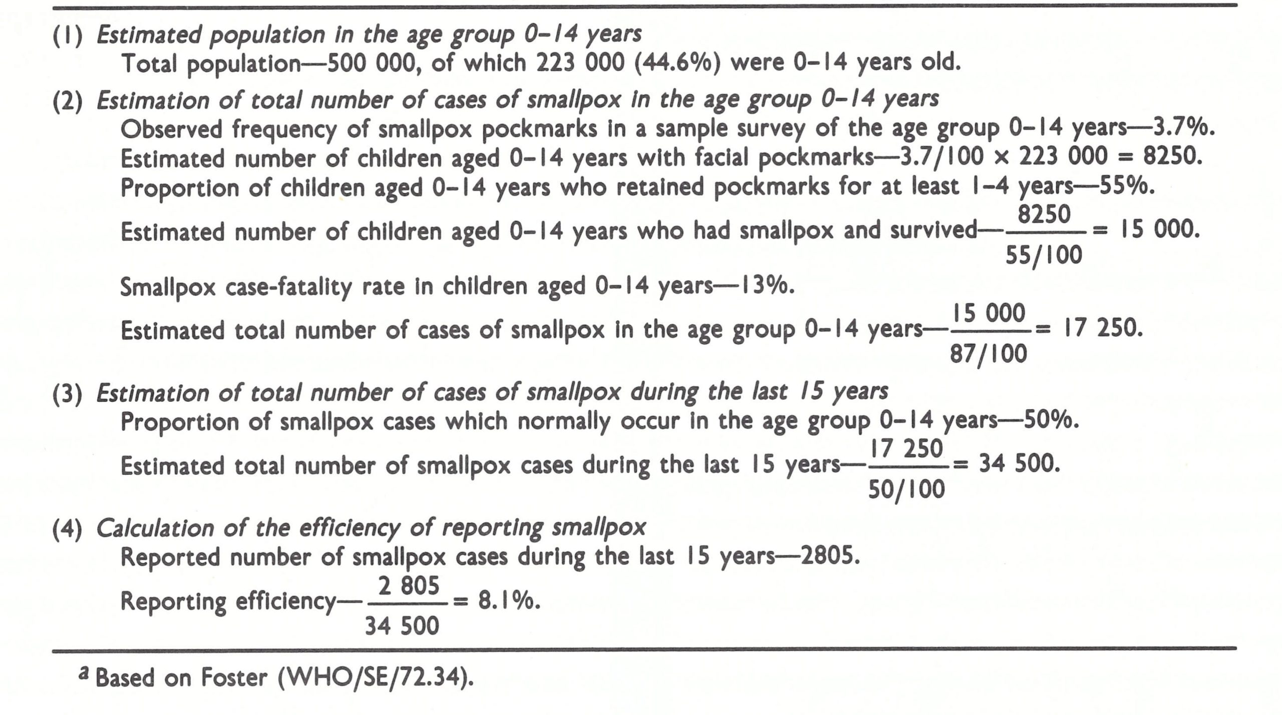 Table 4.1: Efficiency of reporting of smallpox in Kano (an urban area in Nigeria), as estimated from faci a l pockmark surveys in the age group 0-14 yearsa