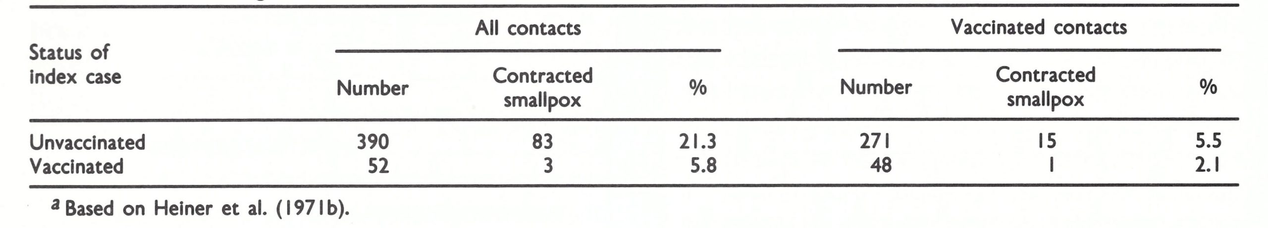 Another investigation in rural villages in Pakistan, which was mainly concerned with inapparent infections (Heiner et al., 1971a), has been discussed at length in Chapter 1. Here we would note that in this study, village residents who were not household or compound contacts of cases were taken as one of the control groups. In contrast to vaccinated compound contacts, over half of whom had had overt or inapparent smallpox, only 6.5% of these other vaccinated villagers in this control group had sustained inapparent infections (none had overt smallpox), again showing the importance of intimate face-to-face contact in the transmission of smallpox.