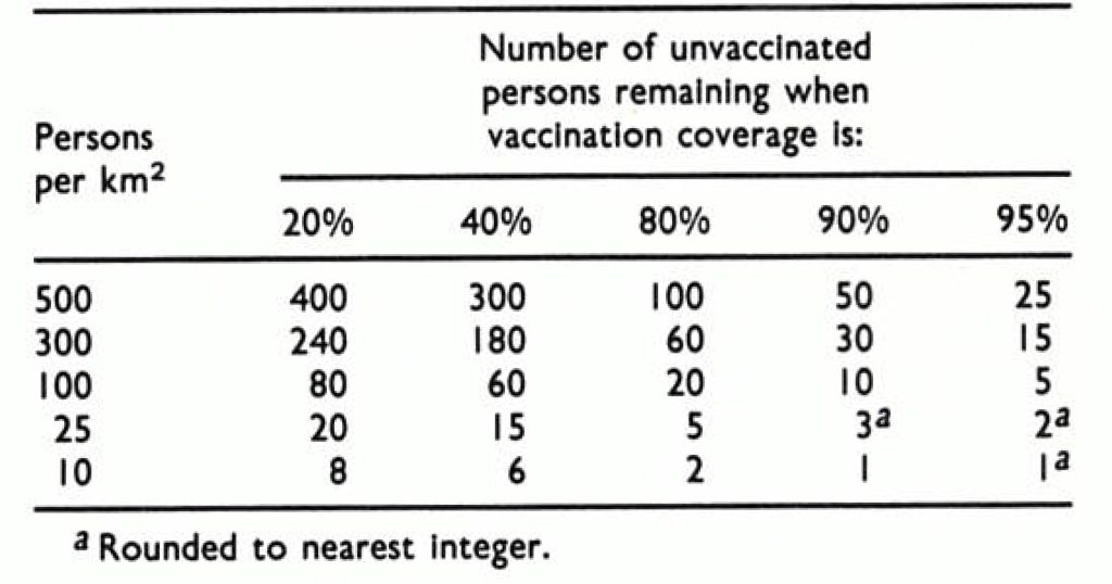 During the smallpox eradication campaigns WHO epidemiologists found that population density, when translated into the density of the susceptible population—i .e., the number of unvaccinated persons per square kilometer-was a useful concept for assessing the difficulty of controlling smallpox by mass vaccination in different endemic countries or different regions within a country (Arita et al.,1986). The effects of population density on the number and density of unvaccinated persons remaining after vaccination coverage at various levels is shown in Table 4.11. It is clear that a vaccination coverage of 80%, which was once recommended by WHO as being adequate to interrupt the transmission of smallpox, may leave a population density of 100 unvaccinated subjects per square kilometre or more in countries with a high population density, such as Bangladesh. This is very much higher than the overall country-wide population density of any African country. Arita et al. (1986) provide an example. In 1967 there was a vaccination coverage of 80.8% in the Matlab Thana, an area of about 194 square kilometers in Bangladesh. The population density was 582 per km/2 , so that the density of unvaccinated persons was 112 per km2 . In that year 119 cases of smallpox were reported (and probably many more occurred). This is not surprising; it would be highly unlikely that smallpox could have been eradicated from Nigeria (population density 54 per km2 ) or the Philippines (population density 116 per km/2 ), for example, with no vaccination at all. Clearly, mass vaccination alone was doomed to failure in countries with high population densities; control could only be achieved when it was supplemented by a vigorous campaign of surveillance and containment (see Chapter 10). Even in countries with low population densities, surveillance and containment greatly accelerated the achievement of eradication.