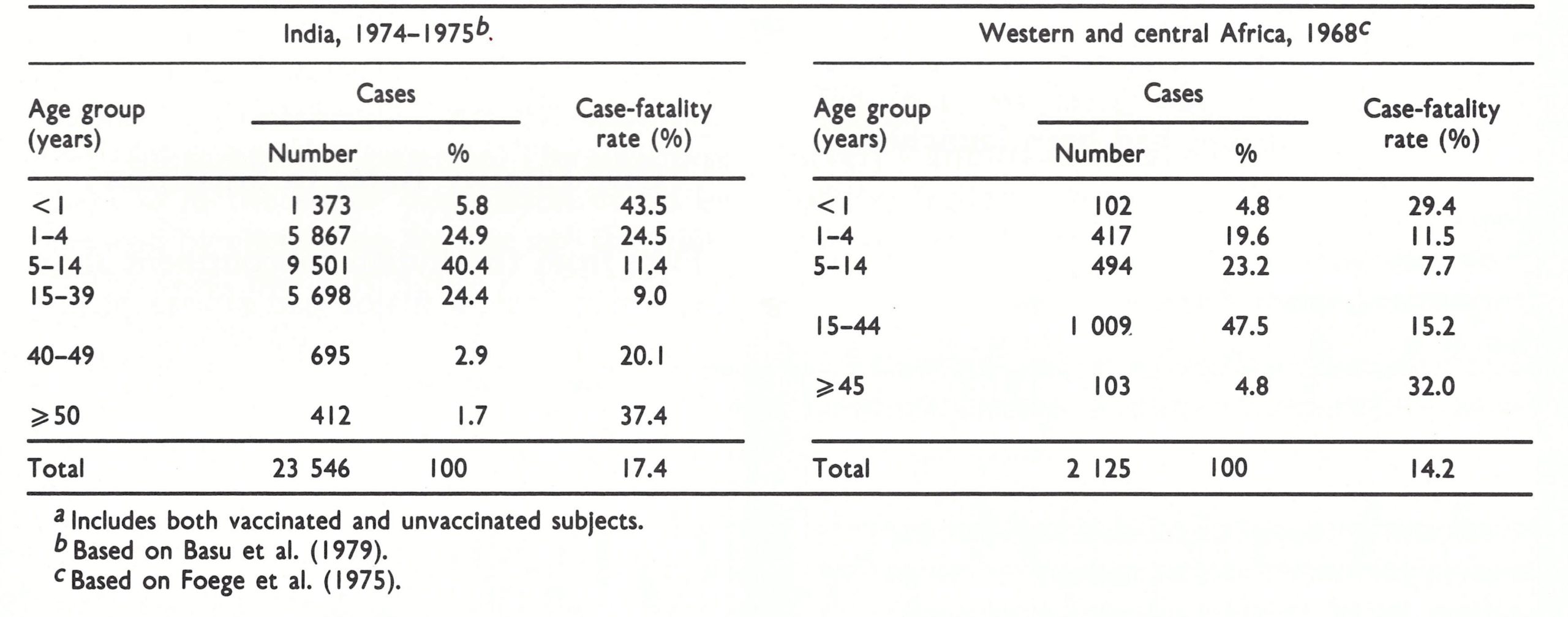 Foege et al. (1975) noted that the age distribution of cases in western and central Africa in 1968 followed closely the age distribution of the population, reflecting the predominant occurrence of cases in isolated and poorly vaccinated rural areas. In India, on the other hand, with its much denser and more mobile population, smallpox was predominantly a disease of children (over 70% of cases in individuals under the age of 15 years: Table 4.2); the situation was similar in Bangladesh, Burma, Indonesia and Pakistan. Since the immunity produced by vaccination in childhood steadily waned, the majority of cases in vaccinated subjects occurred in older age groups (54.3% in persons over 14 years of age: Table 4.3), whereas in unvaccinated subjects 82.3% of cases occurred in children less than 15 years old. The age-related trends in case-fatality rates were similar in India and Africa, the rates being highest in the very young and in older persons. Children and adolescents (10-19 years of age) had lower case-fatality rates than any other age group, a feature which was accentuated when only unvaccinated subjects were considered. However the data are analysed, the case-fatality rates were higher in India than in western and central Africa. Nevertheless, the age distribution of cases clearly influences the overall case-fatality rate for a particular geographical region, and critical comparisons of geographical variability in case-fatality rates would have to assess separately the figures for vaccinated and unvaccinated subjects and consider the age distribution of cases of smallpox. Unfortunately, there are very few large series of cases, from different geographical areas, that give such details; the analyses that follow are the best available.