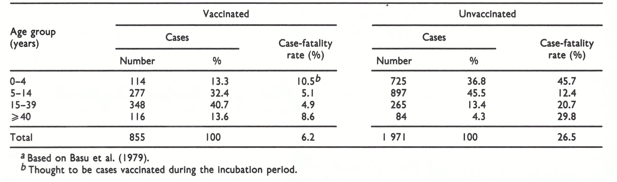 Investigation in Pakistan by Heiner et al. (1971b) confirmed the high secondary attack rate in the Punjab, which reached 77% in unvaccinated compound contacts and 4 .8 in previously vaccinated contacts, all of the latter having been exposed to severe or fatal index cases. Further, vaccinated persons generated many fewer cases among their contacts (4%) than did unvaccinated index cases (11.5%) (see Table 4.10), reflecting the greater severity of the disease in unvaccinated subjects.