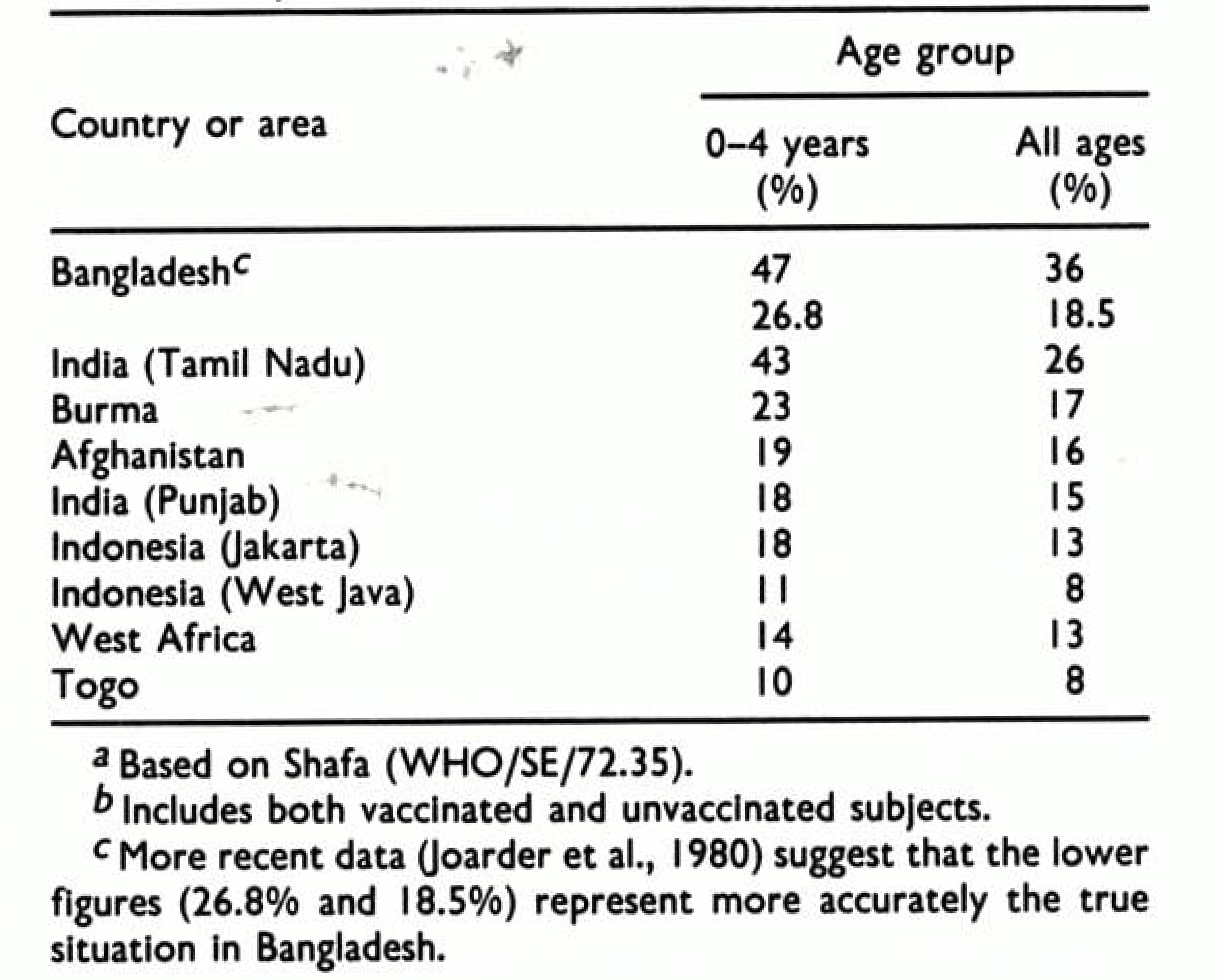 First employed by Dr Jacobus Keja in Nepal and then in Indonesia (see Chapter 13), this method was later used by Foster (WHO/SE/72.34) and Hughes et al. (1980) for assessing the efficiency of reporting in western Africa and Bangladesh respectively. The method involved the examination of persons in appropriate age groups for facial pockmarks (Table 4.1). For survey purposes, a positive case was defined as one which had at least 5 characteristic round, depressed facial scars, a millimetre or more in diameter. By correcting for the observed rate of smallpox mortality in a selected age group, for mortality due to other causes and for the disappearance of facial scars over time (which varied according to the age at which the person acquired smallpox and was determined for each age group and area) it was possible to estimate the incidence rates of smallpox within the sampled population. The smallpox incidence in the entire population could be estimated by correcting for the age distribution of cases, and this figure could then be compared with the number of officially reported cases.