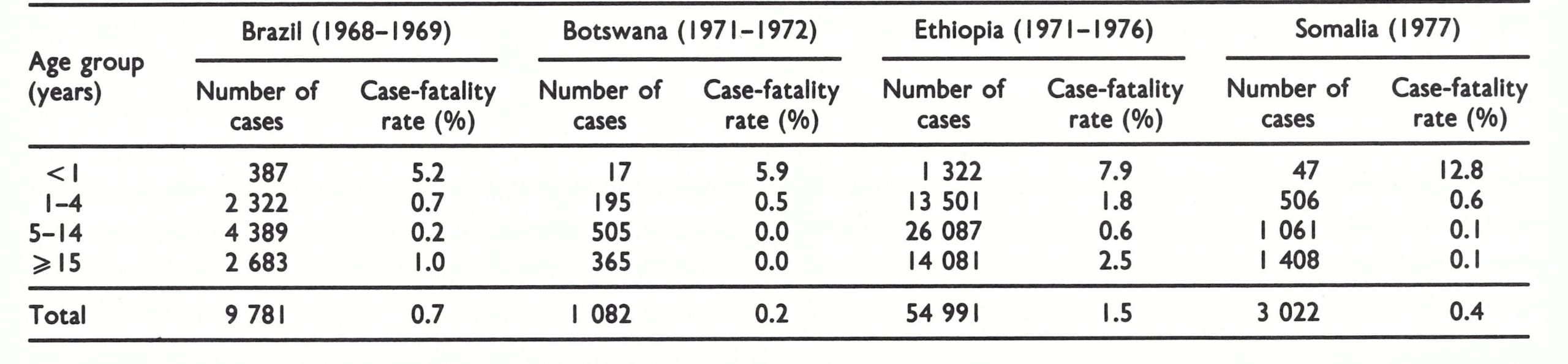 Shafa (WHO/SE/72.35) analysed data from 11 areas for which he considered that reasonably reliable information was available, making adjustments for age-specific case-fatality rates by adjusting the data to a standard age distribution. The case-fatality rates for 9 areas in which variola major was endemic are shown in Table 4.4. They were always higher among infants and children aged 0-4 years than among individuals in older age groups.