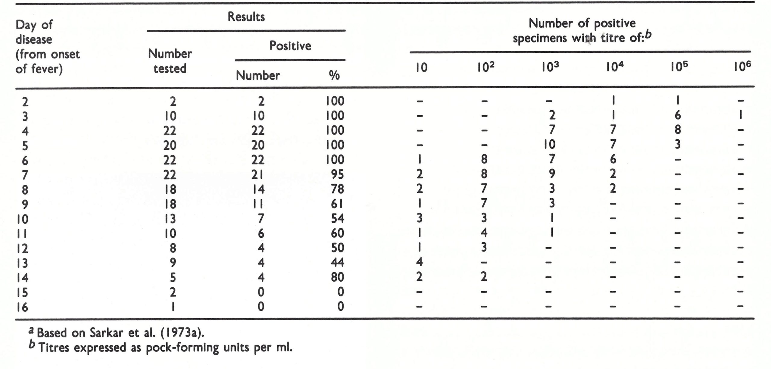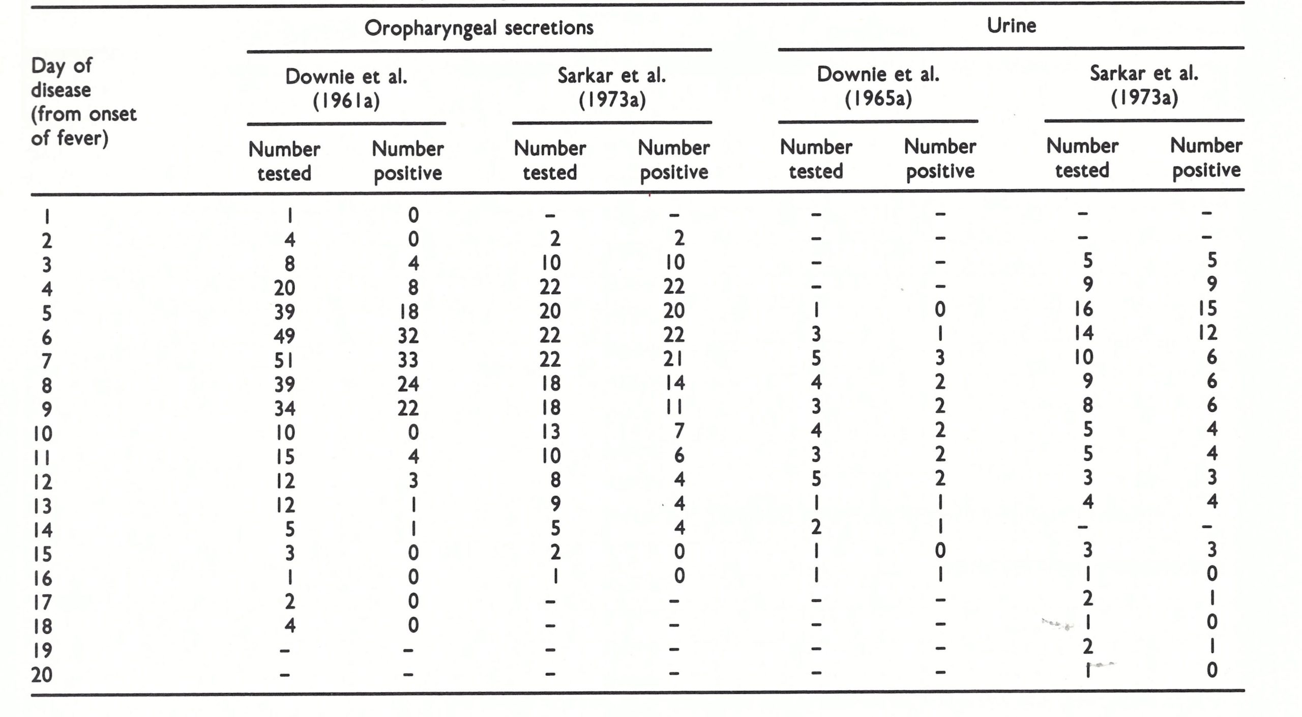 Because there is no tough stratum corneum in the mouth and pharynx, the lesions there ulcerated very soon after their formation (see Chapter 3, Plate 3.7) and released large amounts of virus into the oral and pharyngeal secretions. Several reports are available on the viral content of oropharyngeal secretions in variola major, all carried out with material obtained from cases occurring in the Indian subcontinent (Madras: Downie et al.,1961a; Calcutta: Sarkar et al.,1973a; Bihar: Kitamura et al.,1977b; Karachi: Shelukhina et al., 1973). Table 4.7 sets out the results of the two most extensive studies. The higher proportion of positive results recorded by Sarkar et al. (1973a) probably reflects the different modes of collection of the specimens in the two studies: throat swabs in Sarkar’s series (of which the whole extract in 1 ml of fluid was assayed) and 5ml of mouth washings (of which only 0.2ml or 0.3ml was assayed) in Downie’s series. Besides the volumetric differences, throat swabs could be expected to detach virus particles from superficial lesions as well as including those free in the saliva. Both groups of investigators recorded positive results throughout the period of rash (3rd-14th days).