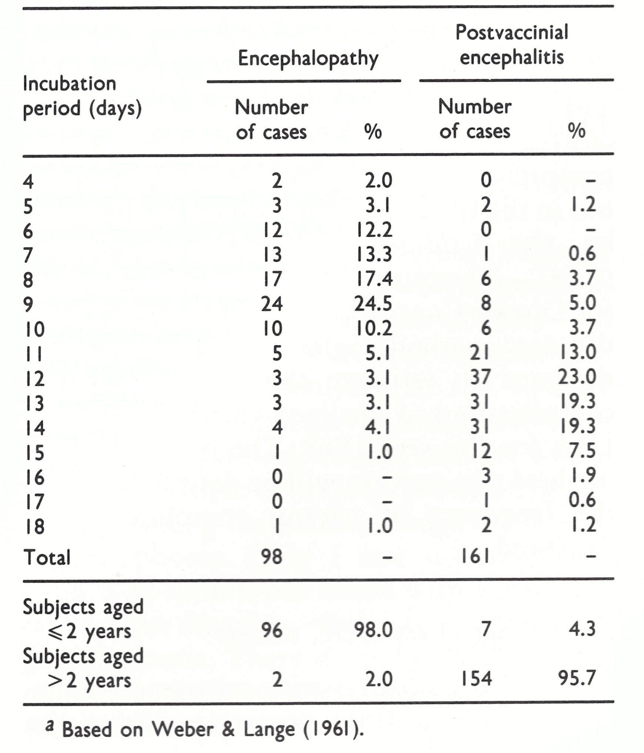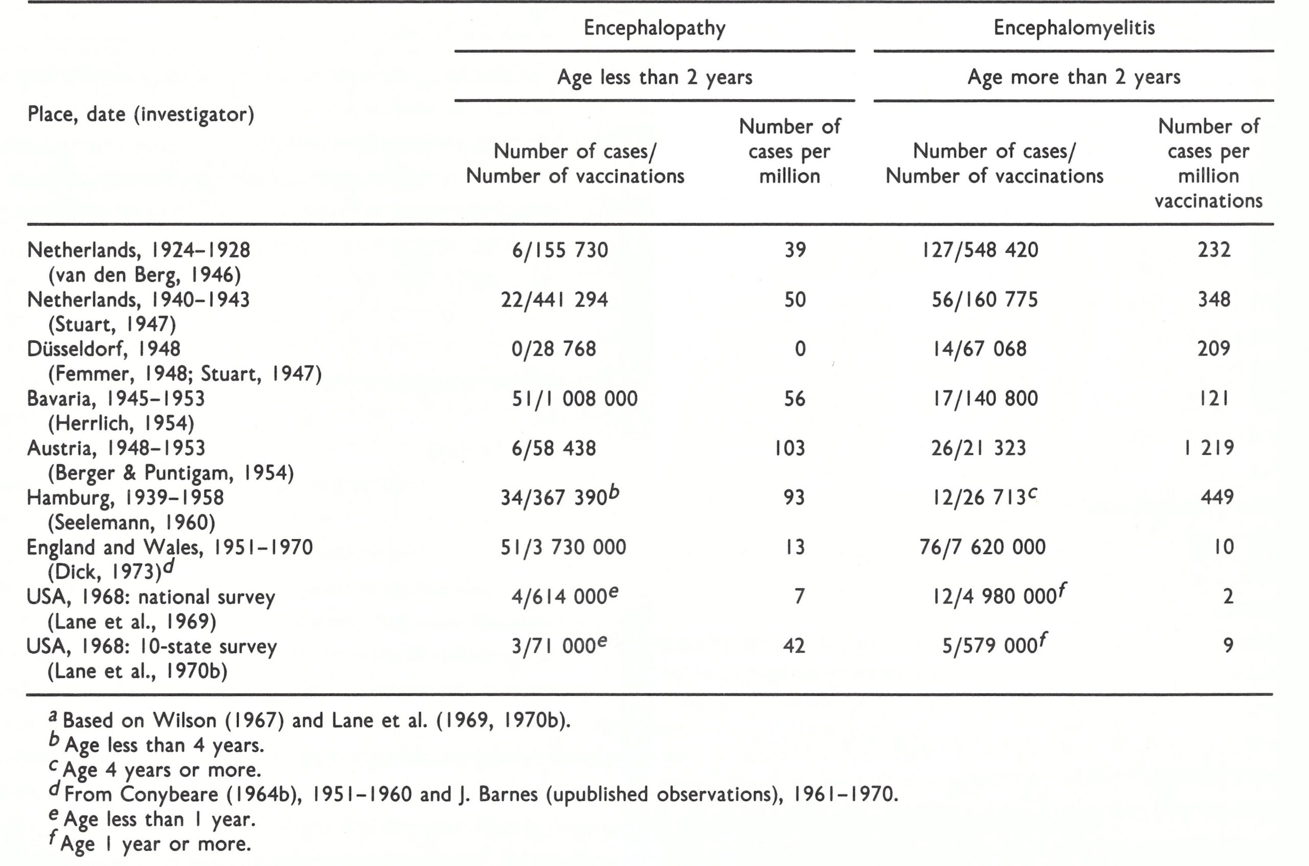 Postvaccinial encephalitis. Although comparisons of data were difficult because of the variability of the criteria for making the diagnosis and the extent of reporting, the frequency of postvaccinial encephalitis varied greatly in different countries. Table 7.8 presents data from 5 countries (9 series of studies) which illustrate dramatically the large differences reported, especially for postvaccinial encephalitis after the primary vaccination of individuals over 2 years of age. All the statistics presented probably include a few cases of encephalitis that were merely coincident with, rather than caused by, vaccination, but the differences in frequencies are so great that they could not have been due solely to diagnostic or statistical eccentricities.