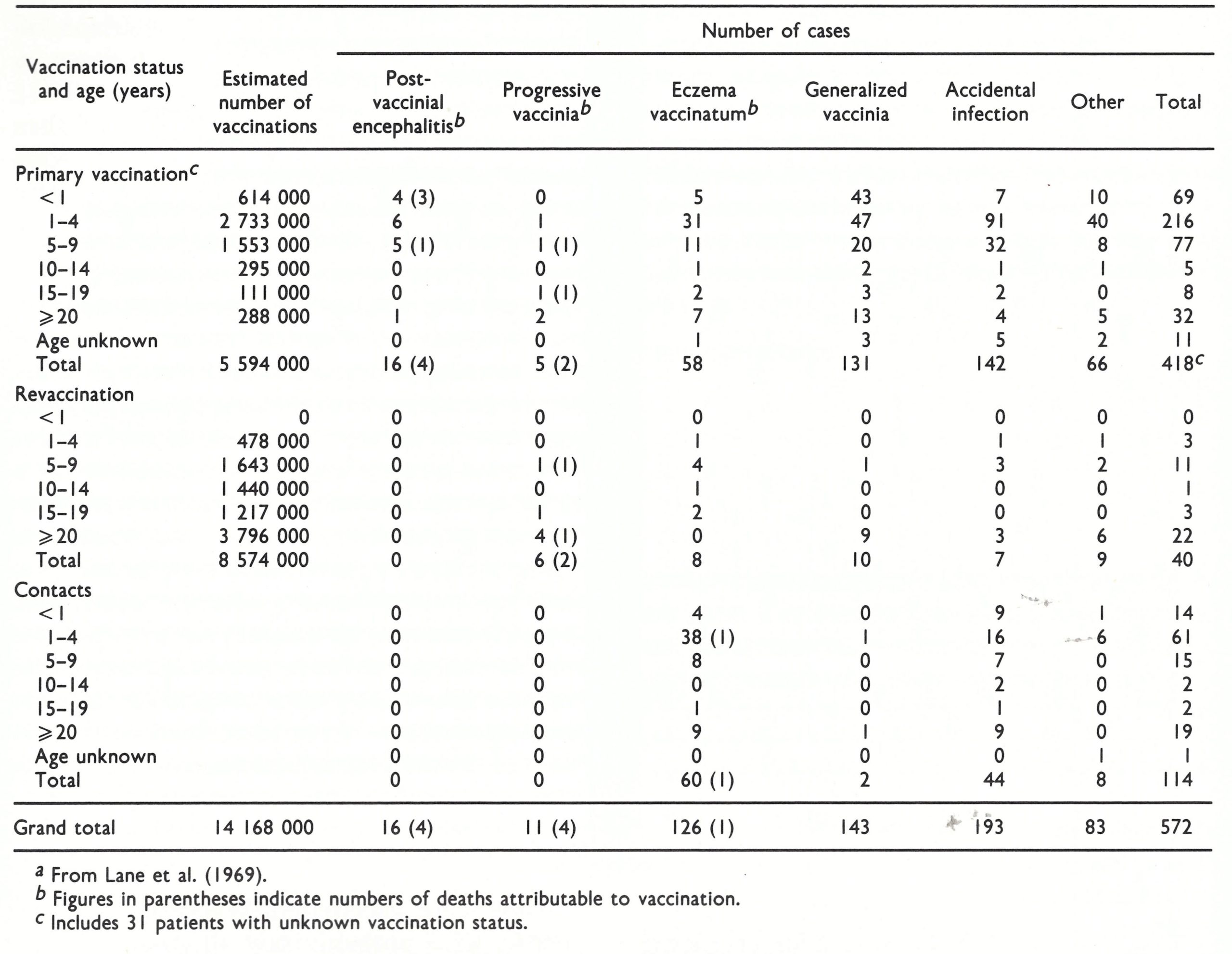 As smallpox transmission was interrupted in various countries, the occasional untoward results of routine vaccination gradually emerged as a public health problem, which concerned both the general public and health administrators. In essence, in smallpox-free countries routine vaccination was maintained or mass vaccination campaigns were undertaken in order to maintain a protective barrier against the spread of smallpox in the population, but this community benefit was gained at the expense of a few individuals who suffered from the complications of vaccination. For example, the last case of smallpox in the USA was reported in 1949 but routine vaccination continued until 1972. The national survey of vaccination in the USA during 1963 carried out by CDC (Neff et al.,1967) showed that among the 14 million persons who were vaccinated against smallpox in that year (6.2 million primary vaccinations and 7.8 million revaccinations), there were 132 cases of severe complications and 7 deaths. From the results of this survey, it could be roughly estimated that between 1949 and 1972 there may have been about 3000 cases of severe vaccinial complications, with some 150 deaths.