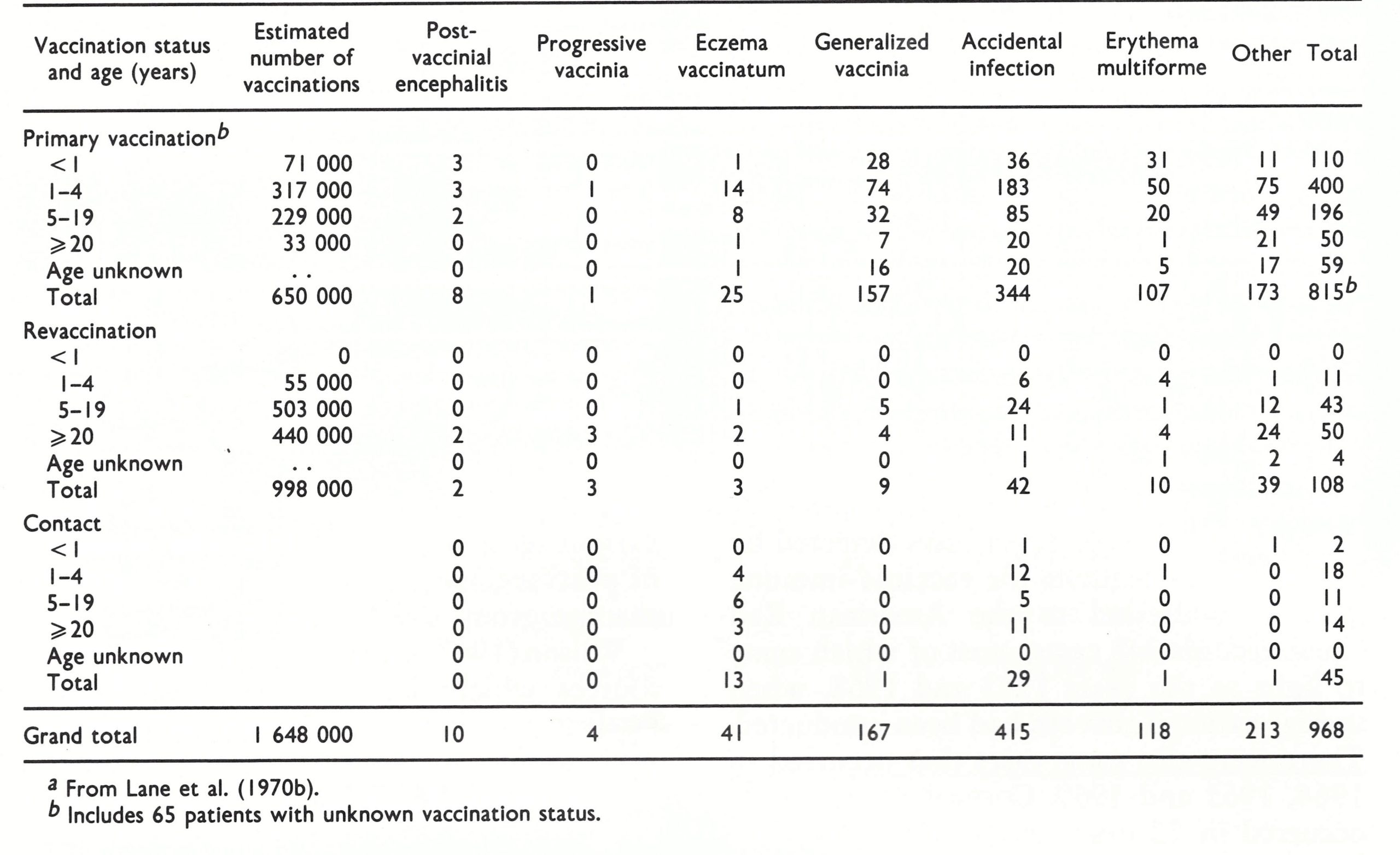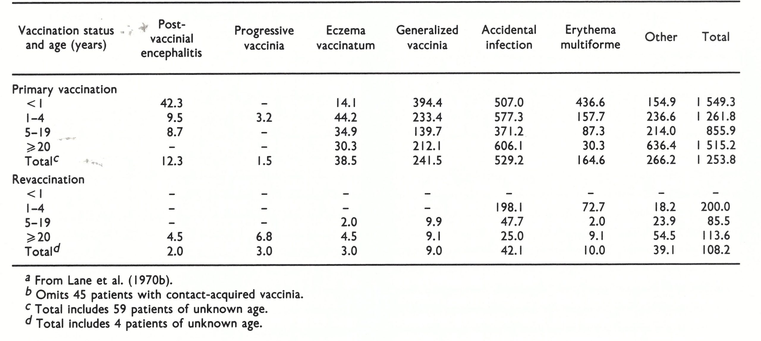 Table 7.4: Complications of smallpox vaccination in the USA for the year 1968, as determined by the CDC national survey. Data of Table 7 .3 expressed as cases per million vaccinations a,b