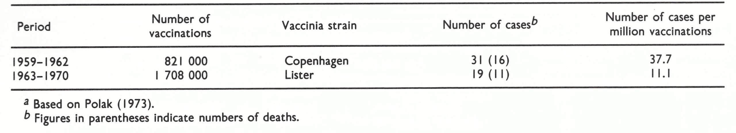 Several different strains of vaccinia virus were used in Belgium and the Netherlands during the 1950s; the incidence of postvaccinial encephalopathy in infants dropped substantially after the Lister strain was introduced in the Netherlands in 1963 (Table 7.9). In Switzerland and Austria the number of reported cases of postvaccinial encephalitis fell dramatically after the Bern strain was replaced by the Lister strain in 1962 and 1967 respectively (C. Fleury, personal communication, 1967; Berger & Heinrich, 1973).