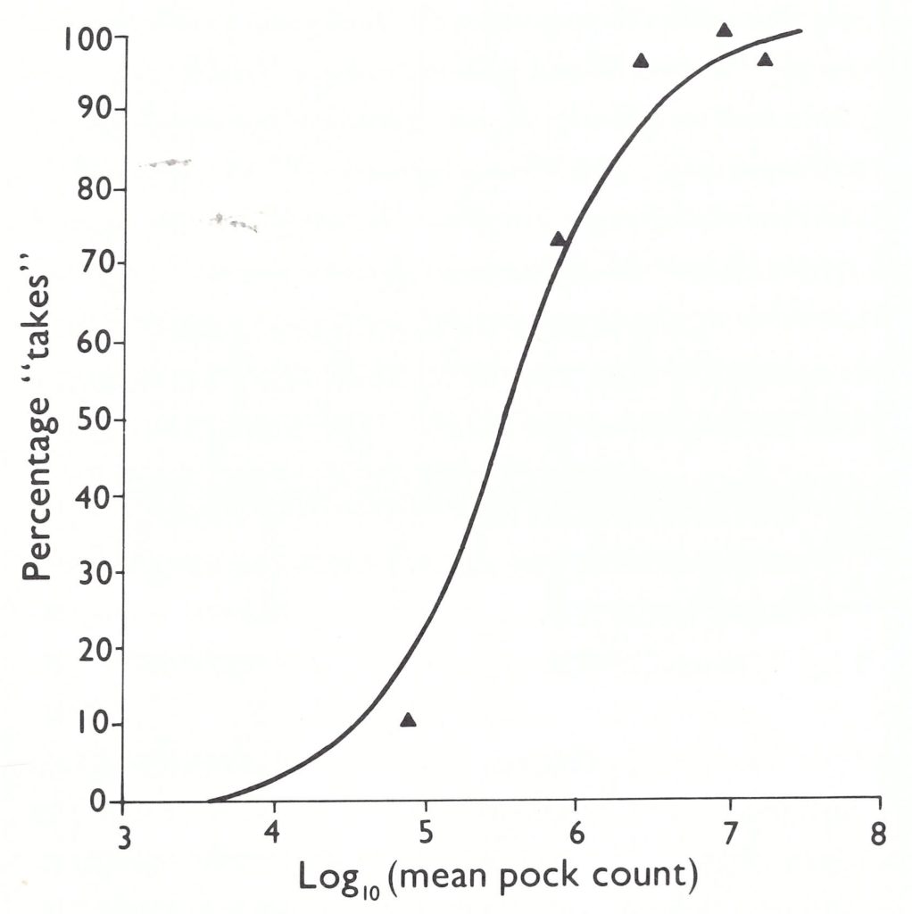 Changes were also made in the recommended method of titration. Following the observations by Cockburn et al. (1957) that pock counting was considerably more precise than rabbit scarification (see Table 7.1) and that pock counts correlated well with take rates (Fig. 7.1), the 1959 recommendation that rabbit-skin scarification and pock counting were acceptable alternatives was changed so as to eliminate scarification.