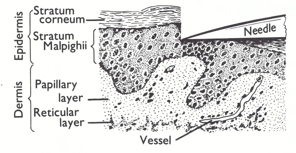The skin was prepared for vaccination by scarification, using the same principle as for the vaccination of humans (see below)—namely, to bring the virus into contact with cells in the Malpighian layer of the epidermis. However, the operation was on a much larger scale, the aim being to produce a confluent take on a large area of the flank and abdomen. The usual procedure was to make a series of parallel scratches about 1 cm apart on the cleansed flank and abdomen of the vaccinifer, followed by a similar series of scratches at right angles to the first. A wide variety of instruments was used in different laboratories, sufficient force being exerted to produce obvious erythema of the skin, but not bleeding. The prepared skin was then inoculated by rubbing seed virus of high infectivity into the superficial scarifications. Practical considerations limited the extent of the area scarified, because in some countries animals in rather poor health were used, and too extensive scarification might have caused their death.