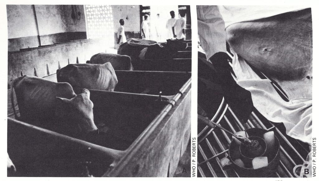 Plate 7.1. The preparation of smallpox vaccine at the Vaccine Production Institute, Dhaka, Bangladesh. A: Calves to be used for vaccination were held in quarantine for 7 days. B: Four days after scarification, the skin was scraped with a sharpened stainless-steel spoon and the vaccine pulp collected in a jar, for subsequent grinding and centrifugation to yield the vaccine lymph.