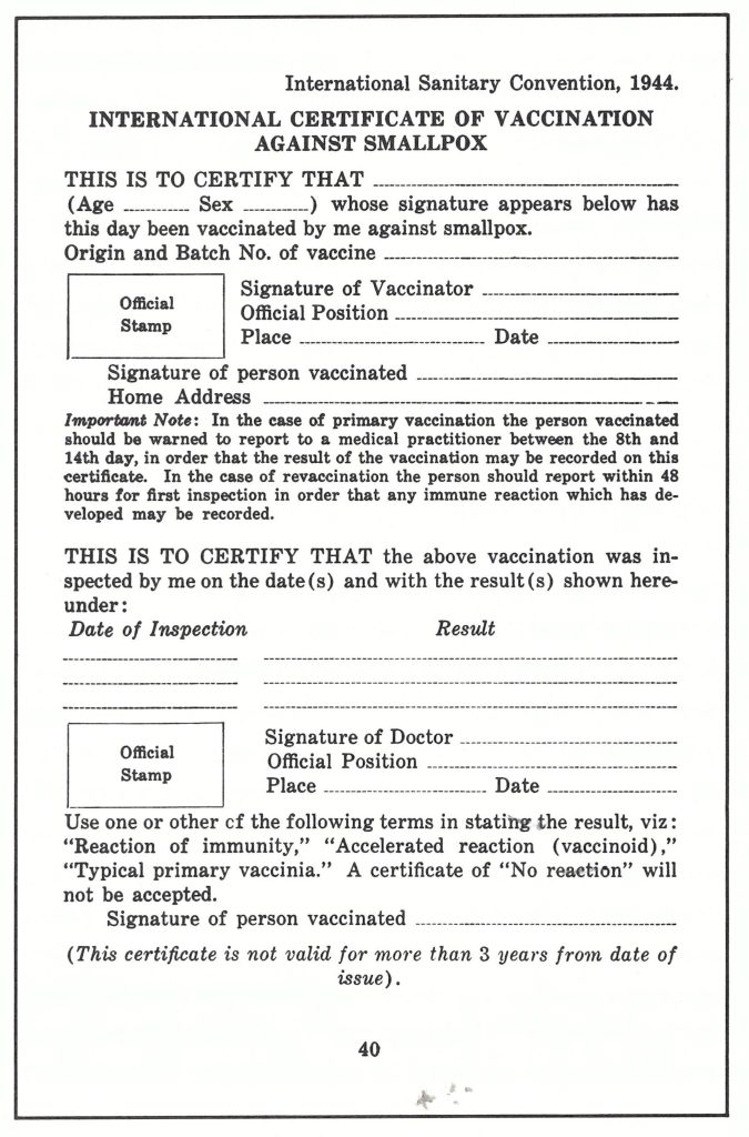 Plate 7.11. The first International Certificate of Vaccination against Smallpox developed by the International Sanitary Convention in 1944.
