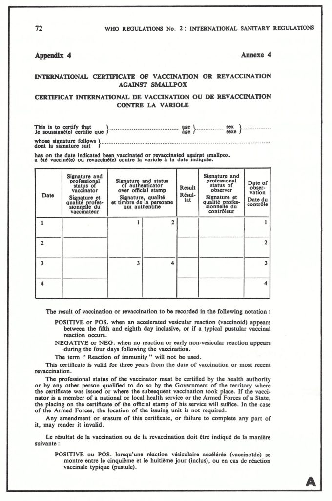 The 1944 International Sanitary Convention (United Nations Relief and Rehabilitation Administration, Health Division, 1945) amended the previous Convention, formulated in 1926, and devised a vaccination certificate (Plate 7.11), which required that the vaccinial reaction should be inspected 8-14 days after the primary vaccination and 48 hours after revaccination. A certificate was not valid for more than 3 years.