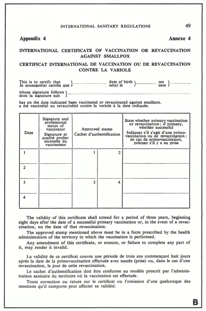 Plate 7.12. A: The form proposed to the Fourth World Health Assembly in 1951, by the committee drafting the International Sanitary Regulations.