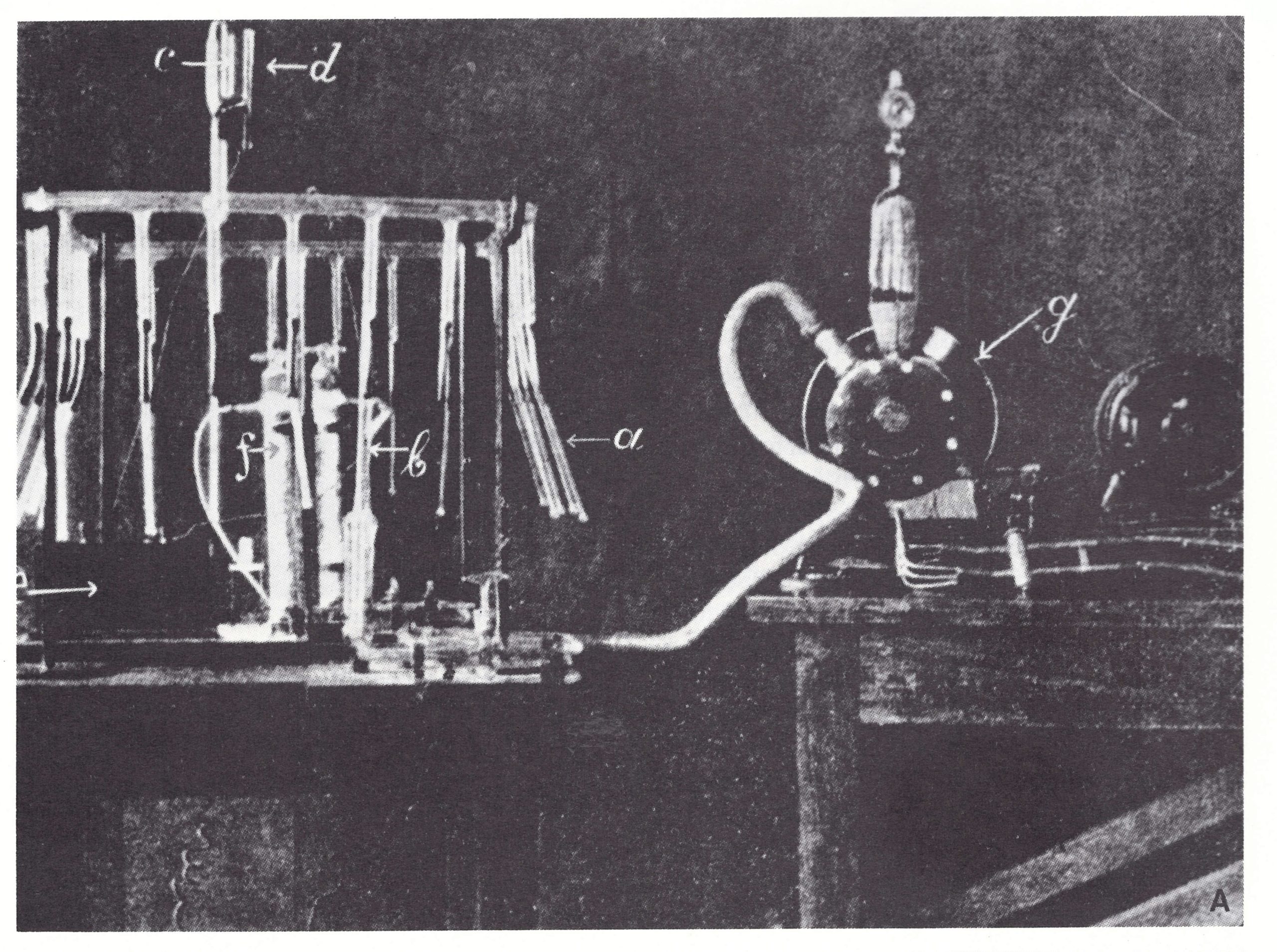 Plate 7.3. A: Apparatus used by Otten (1927) for evacuating ampoules containing airdried vaccine before sealing. (From Olivier et al ., 1932.) B: Commercial development of Hornibrook’s apparatus used for making freeze-dried vaccine in Peru in the early 1950s.