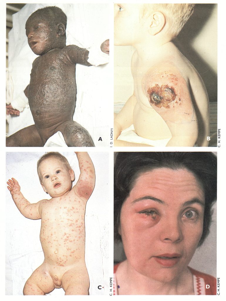 Apart from the CDC survey, few data on the frequency of this complication are available. In the mass vaccination campaign that followed the importation of smallpox into New York in 1947, during which 5-6 million people were vaccinated (but childhood eczema was accepted as a contraindication to vaccination), 10 cases of eczema vaccinatum occurred among vaccinees and 28 cases among persons who had not been vaccinated but had been in intimate contact with a recently vaccinated subject (Greenberg, 1948). There was an outbreak of smallpox in South Wales in 1962-1963 and about 900 000 persons were vaccinated. Waddington et al. (1964), who probably saw all patients with severe skin eruptions, recorded 35 cases of eczema vaccinatum (10 in vaccinees, 25 in unvaccinated contacts), with 2 deaths. The authors emphasized that the severity of eczema vaccinatum was independent of the activity of the underlying eczema, which in most patients was quiescent at the time of infection. This suggests that the virus often reached the skin by the haematogenous route, rather than as a result of the direct infection of eczematous lesions.