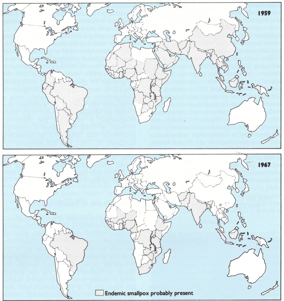 The decision by the Twelfth World Health Assembly, in May 1959, to undertake the global eradication of smallpox marked the beginning of a programme which, some 18 years later, would witness the last naturally occurring case. The Health Assembly’s policy, which made the global eradication of a disease one of WHO’S goals, was not without precedent, a similar decision with regard to malaria having been taken 4 years before.