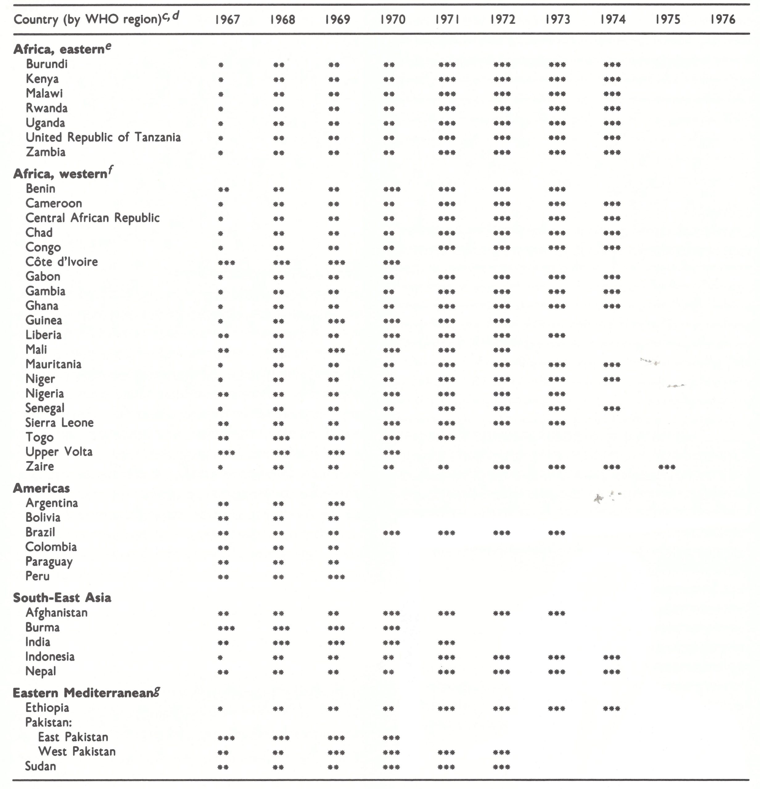 Table 9.10: Planned phasing of smallpox eradication programmes assisted by WHO, 1967- 1976; extracted from the Director-General’s report to the Nineteenth World Health Assemblya,b