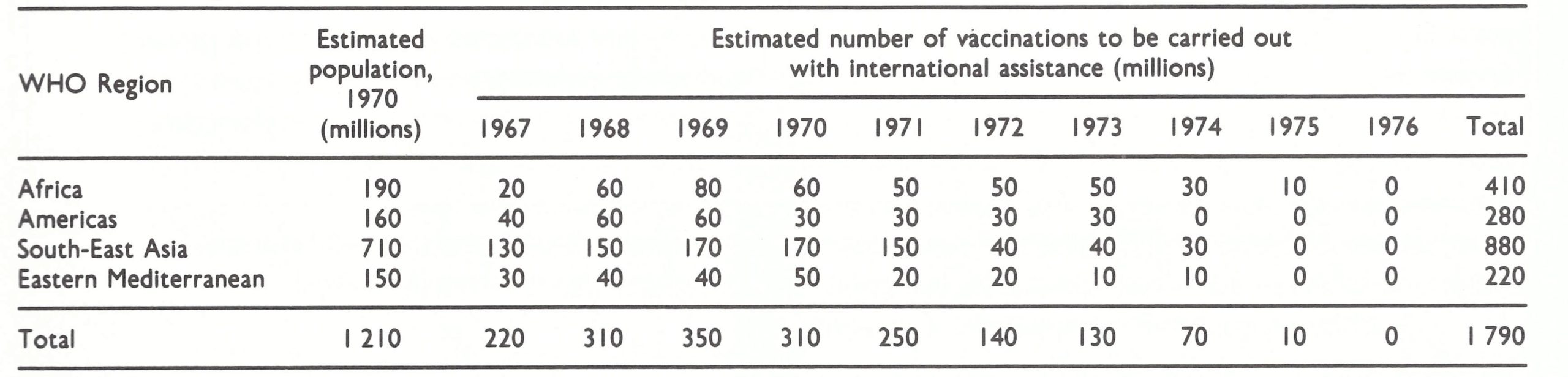 Table 9.11: Estimated number of smallpox vaccinations to be carried out with international assistance, 1967-1976; extracted from the Director-General’s report to the Nineteenth World Health Assembly