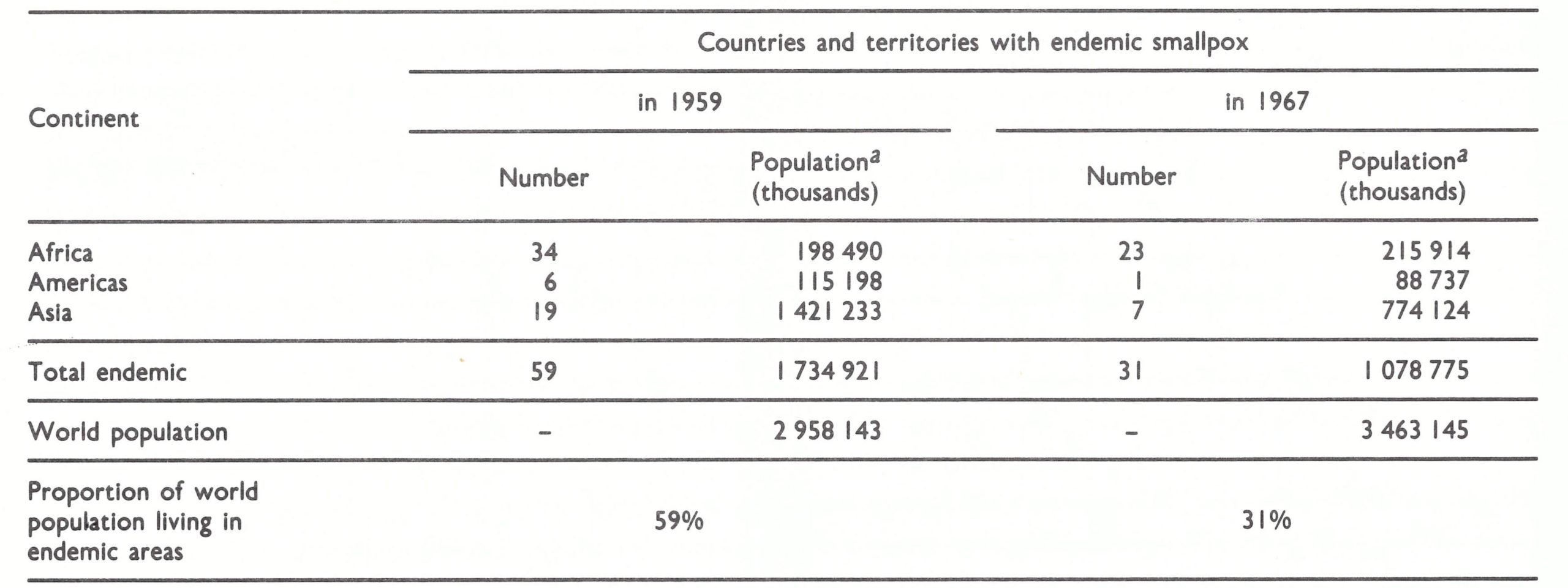 As the Intensified Programme commenced operations, however, the areas with endemic smallpox were actually substantially smaller than they had been in 1959 (see Table 9.6). The information now available indicates that in only 31 countries or territories, with a total population of 1 078 775 000, was smallpox endemic in early 1967, compared with 59 in 1959. Nevertheless, the problem remained formidable.