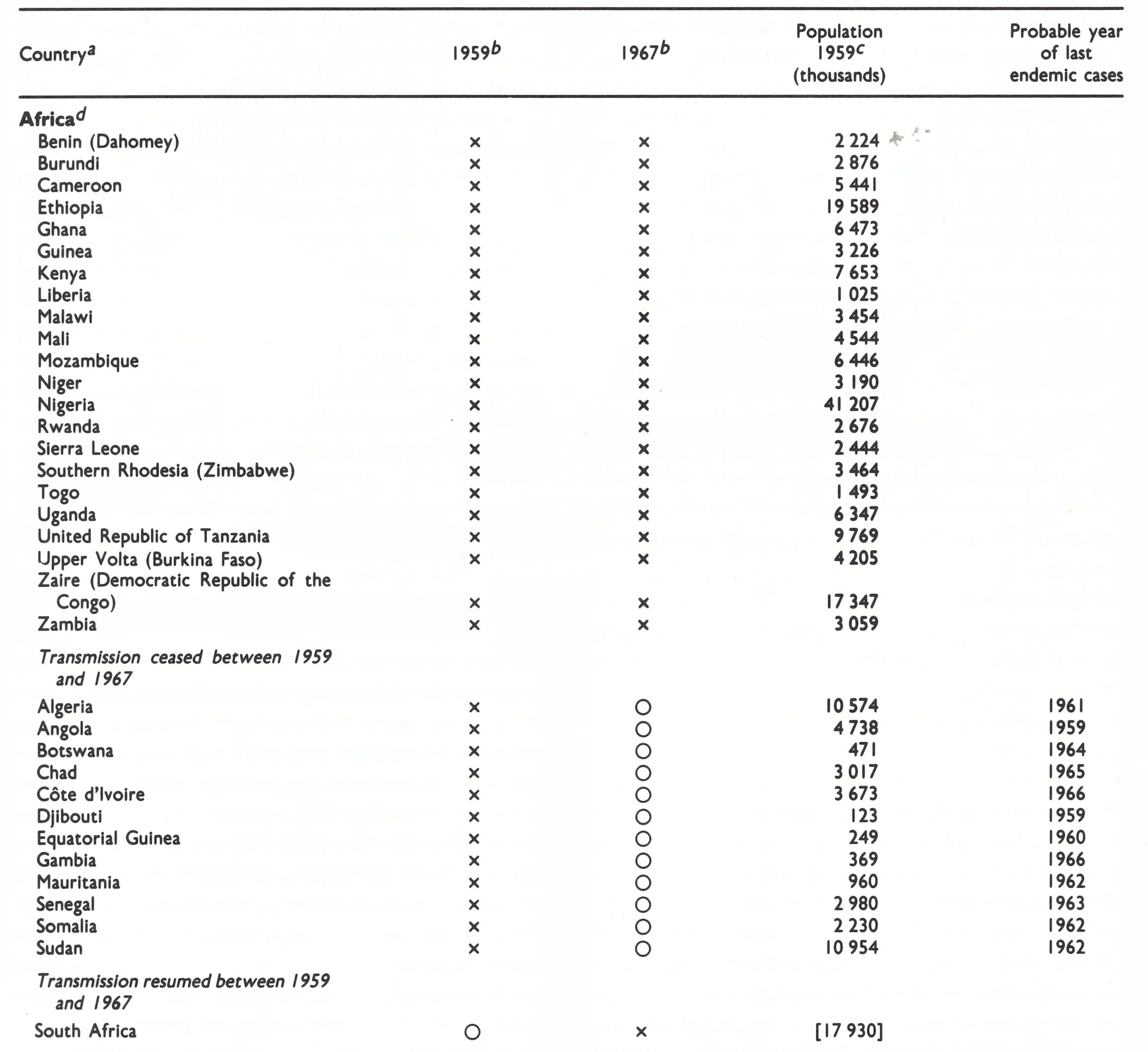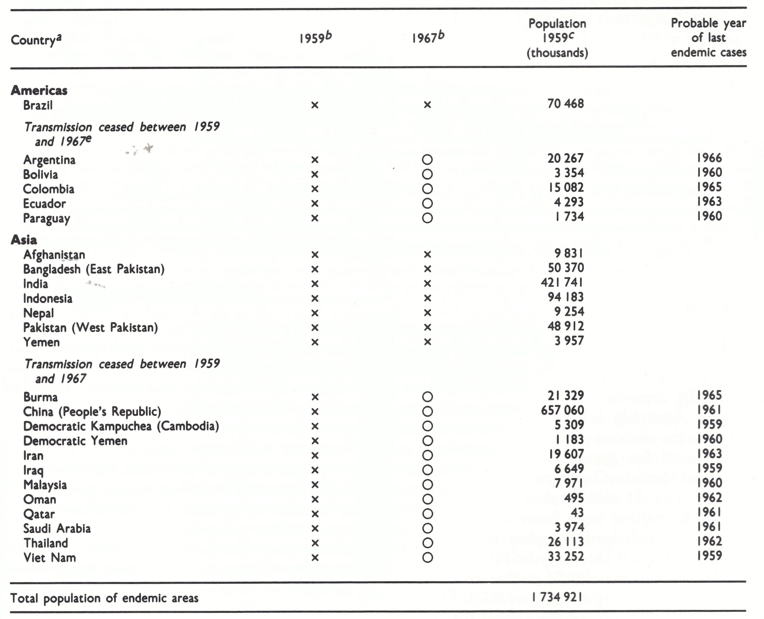 The report defined the endemic countries at the end of 1965 as including 6 in Asia (Afghanistan, Burma, India, Indonesia, Nepal and Pakistan), 3 in South America (Brazil Colombia and Peru) and essentially all African countries south of the Sahara. The cases officially reported to WHO in 1964 numbered Just under 50 000; essentially the same number was reported in 1965, and this was not significantly different in magnitude from the 60 956 cases recorded in 1960. It was pointed out, however, that little credence could be given to these figures.
