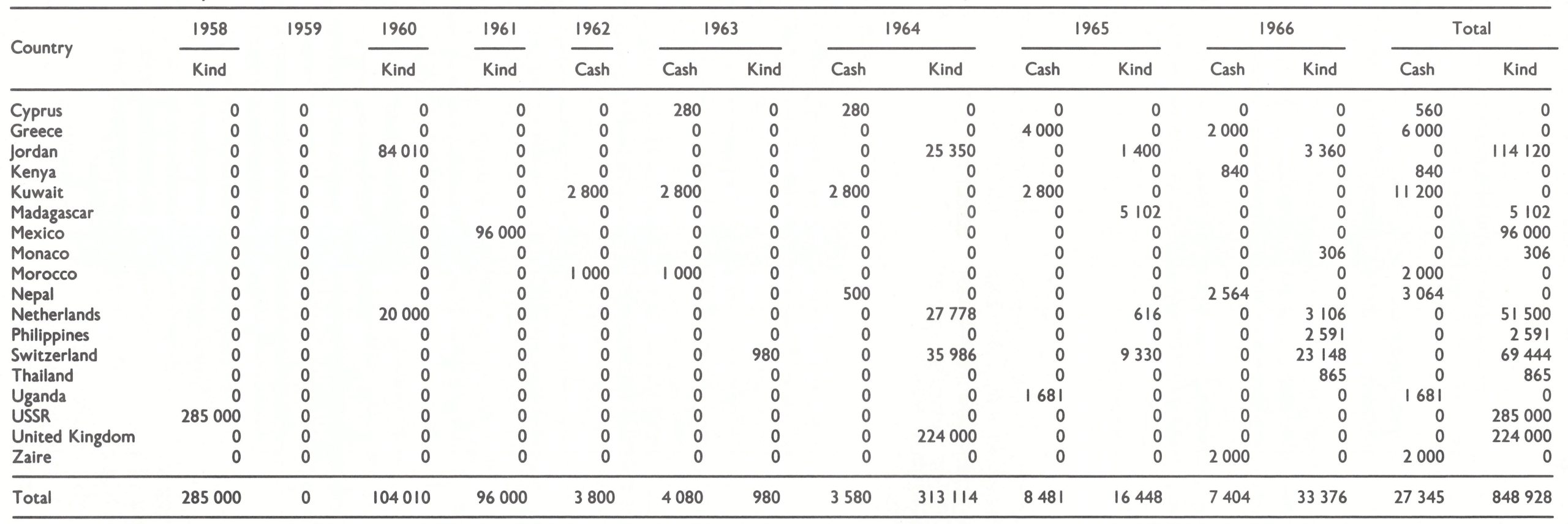 Voluntary contributions to the programme during 1966 continued to reflect the general lack of interest among donors. Apart from vaccine donated by Switzerland, contributions in cash and in kind from Greece, Jordan, Kenya, Monaco, Nepal, the Netherlands, the Philippines, Thailand and Zaire were valued at only US4117 632.